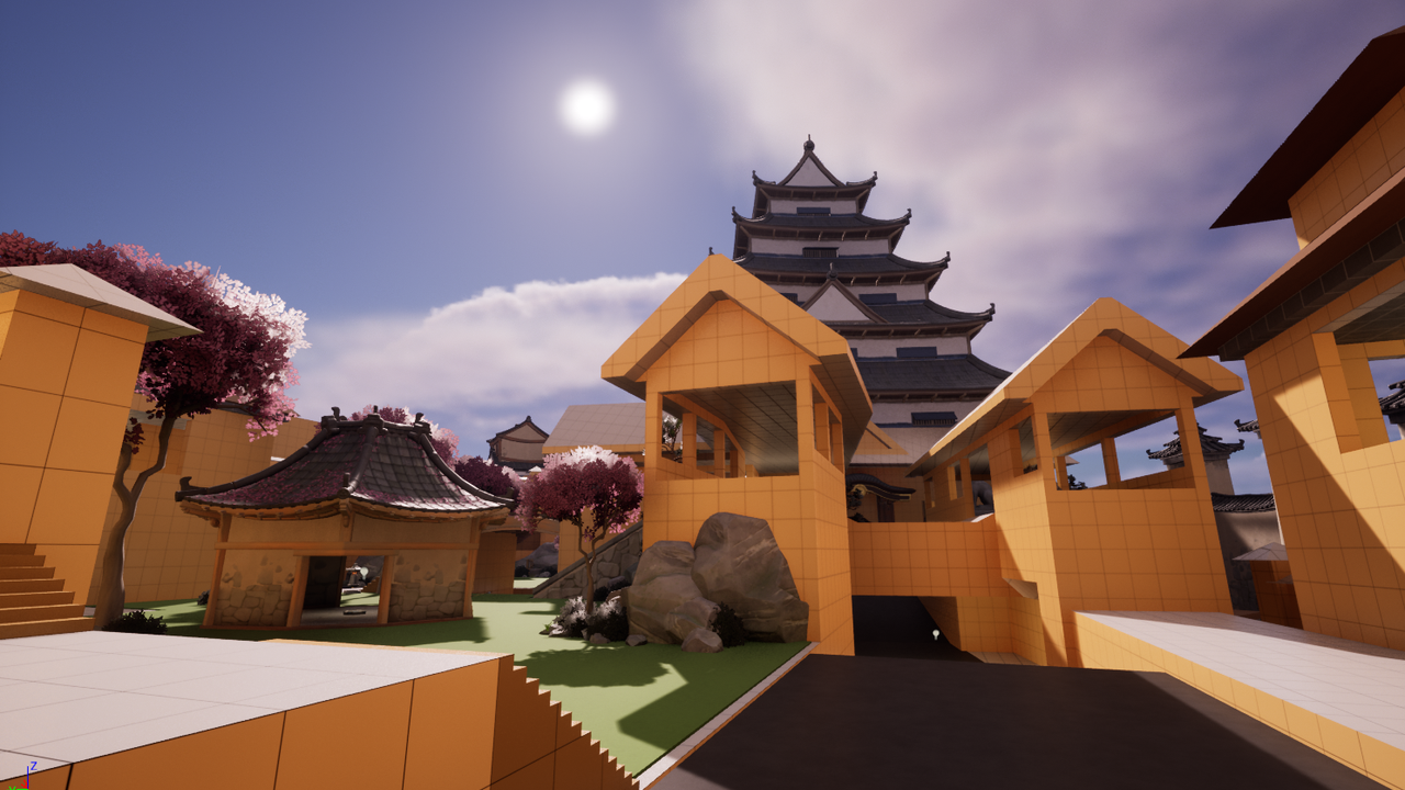In Hana No Komichi I aimed to create a sense of progression as attackers slowly fight an “uphill battle”. This naturally gives defenders a height advantage and creates a positive flow as attackers gain new vantage points as they progress throughout the level. I also aimed to make the changes in height mostly flat angles, to avoid “head peaks” where its challenging for both sides to make out players.